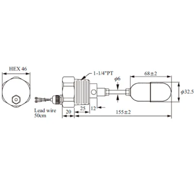 Поплавковый магнитный датчик предельного уровня жидкости в корпусе из нержавеющей стали с горизонтальной установкой, 1-1/4"PT, поплавок Ø32,5*68, L=155 мм, плотн.от 0.65, SPST, -20...+100 С, 220VAC/200VDC