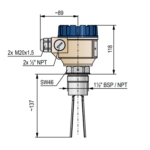 Вибрационный датчик предельного уровня сыпучих материалов в пластик. корпусе, резьба 1 1/2" BSP, зонд 137мм, чувствит. от 10 г/л,выход 2SPDT реле 1х250VAC 8A /6А, -40...+130С, IP67