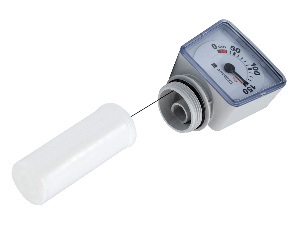 Присоединение к емкости резьбовое трубное 1,5 или 2 дюйма. Поворотная шкала 0…1,5 или 0…2,5 метров. Ударопрочный корпус из ABS пластика. Буек изготовлен из полиэтилена высокого давления. Гидростатическая сила, выталкивающая буек, перемещает стрелку индикатора с помощью планетарной передачи.