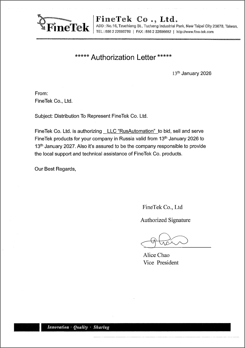 С 2018 года Компания РусАвтоматизация является авторизированным дилером группы компаний FineTek Co.Ltd на территории Российской Федерации.